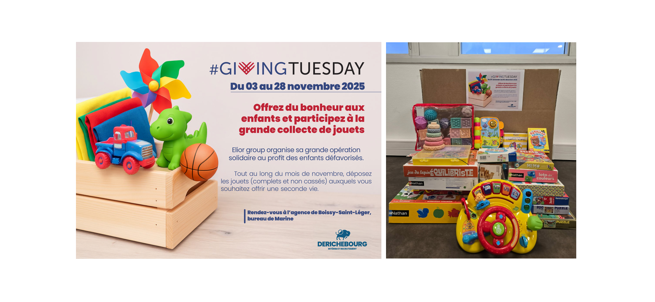 Comme chaque année, DERICHEBOURG Intérim et Recrutement s’est mobilisé pour offrir un sourire aux enfants à l’occasion des fêtes de fin d’année. Notre collecte de jouets, destinée à être redistribuée via des associations locales partenaires, a permis de donner une seconde vie à de nombreux jeux et objets en bon état.